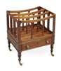 with three divisions above an apron drawer, raised on turned tapered legs ending in brass caps and casters