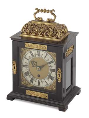 the dial with a silvered chapter ring with Roman numerals and marked at the five minute intervals with Arabic numbers, the spandrels with gilt winged putto masks, in an ebony case with a pierced basket top and loop handle, the glazed side panels with pierced gilt bronze sound openings above, the movement with a silent pull cord quarter repeat and two bell strike on the hours and quarters, verge escapement, the backplate engraved with foliate scrolls and a central cartouche signed 'Samuel Watson', the bottom of one plate with the initials 'S.V.' and dated 1687