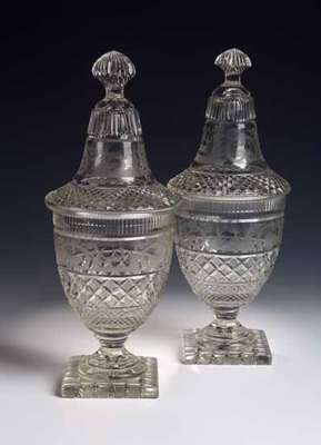 A matched pair of cut glass urns and covers