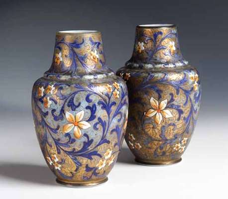 A pair of continental enamelled squat baluster vases