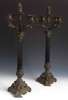 each with four scrolling branches and central candlebrum fitted with flame cast stopper, the whole supported on trefoil section column, with shell and scroll cast tripod base