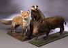 baring its teeth and resting on a tree stump, on a moulded wooden plinth bearing plaque 'Blaveau'
