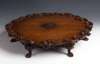 the top of circular form, centred by a rose carved in relief, the rim boldly carved with scrolls and fruiting foliage, raised above a frieze carved with fruits and leaves on squat cabriole legs with carved paw feet