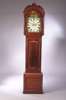 the twin train movement with anchor escapement, the arched and painted dial with Roman chapters painted to the spandrels with neo-classical representations of the seasons and to the arch with a highland scene, the wood with scroll carved cresting above turned columns, the trunk with ogee arched door above a panel base on a plinth (two weights, pendulum, winder)