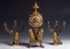 comprising a clock, the twin train movement and circular cast dial with enamelled Roman chapters, the ovoid case with finial surmount above a spreading column and laurel cast base set with three seated hounds, linked by chains, the whole raised on hoof feet, 44.5cm high, with two attendant candlebra cast with oak leaves on Rococo bases