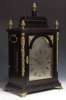 the twin train fusee movement striking the hours on a steel bell, the arched steel dial with Roman chapters enclosed within case with caddy top set with cast pineapple finials, the door set with cast spandrels, the angles with applied fruit cast mounts, raised on a moulded base with brass bracket feet, brass side carrying handles