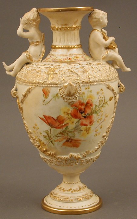with slender neck having opposed cast seated cherubs over gilt scallop decorated neck and opposed painted poppy panels with relief swag surround on slender circular foot, painted mark