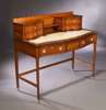 with boxwood and ebony stringing, the superstructure with waved surmount above central open shelf enclosed by serpentine drawers, the whole raised above square section tapering legs united by stretchers and terminating in silvered caps and castors