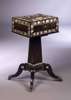 the rectangular top enclosing four removable lidded boxes and two moving compartments, on concave tapering pedestal and conforming plinth with sabre legs and brass caps and castors