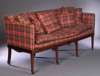 with boxwood stringing, the square back above downswept square fronted arms, glazed cotton plaid upholstery with seat squab and cushions, seat rail centred by tablet on square section tapering legs with brass caps and castors