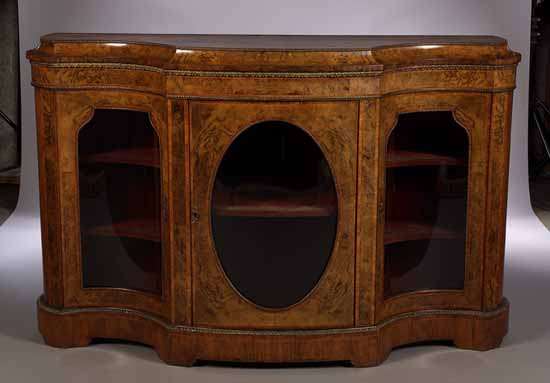 with kingwood crossbanding and gilt brass mounts, the shaped top with stepped concave frieze above bowfront central door with oval glass enclosing lined shelved interior, flanked by concave cupboards with flat arched glazing and bowed sides, on plinth base