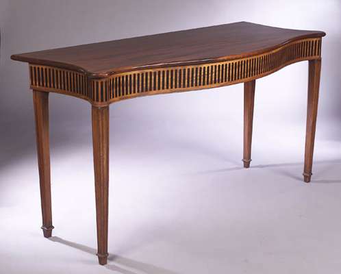 the shaped top with moulded edge above frieze with inlaid ebony fluting, raised on moulded square tapered legs with toupie feet