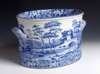 with twin lug handles and horizontal ribbed decoration printed with fishermen by a bridge in a rustic scene, continuous flowerhead frieze to inner rim and foot, impressed and printed Spode marks
