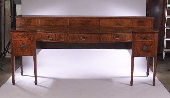 with boxwood stringing, the stage back above bow front with three drawers flanked by false fronted cellaret drawers on square section tapered legs with round dot terminals and collared feet