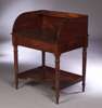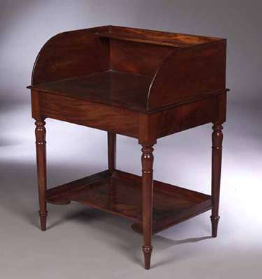 the rectangular top with deep three quarter splash back incorporating shelf, above deep frieze and turned tapering legs joined by shaped undershelf with three quarter gallery
