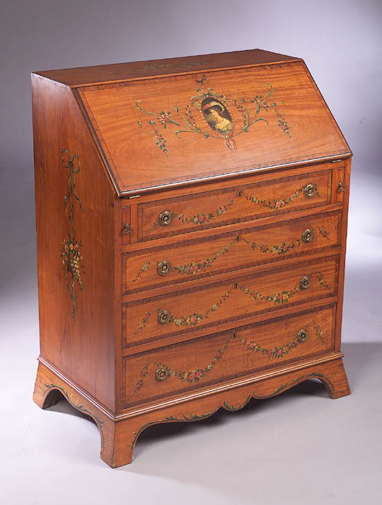 with neo-classical painted decoration and rosewood corssbanding, the rectangular top above fall front centred by a bust of a lady, enclosing fitted interior, four long graduated drawers and lopers, on splayed bracket feet and shaped apron