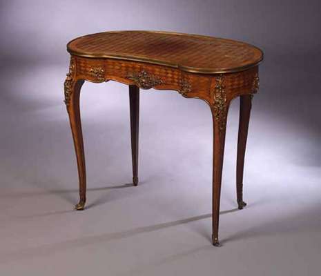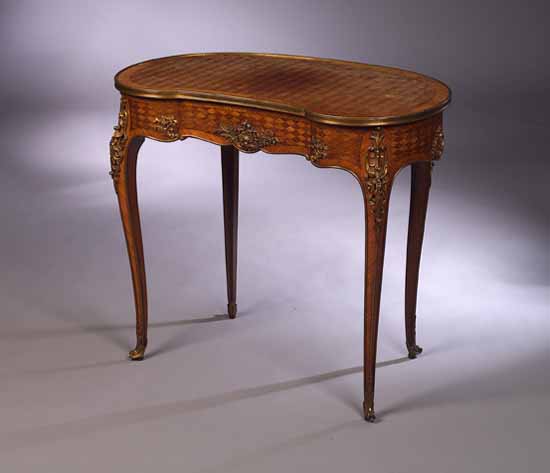 An Edwardian kingwood and parquetry kidney shaped writing table