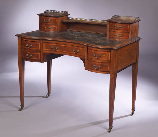 with boxwood stringing and satinwood banding, the superstructure with pierced brass rail above open shelves and stationary drawers, the shaped top with inset skiver above an arrangement of five drawers on square section tapering legs