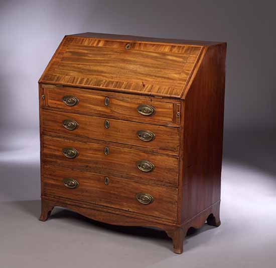 with boxwood stringing, the crossbanded fall front enclosing fitted interior above four long graduated drawers and lopers, on shaped apron and splayed bracket feet