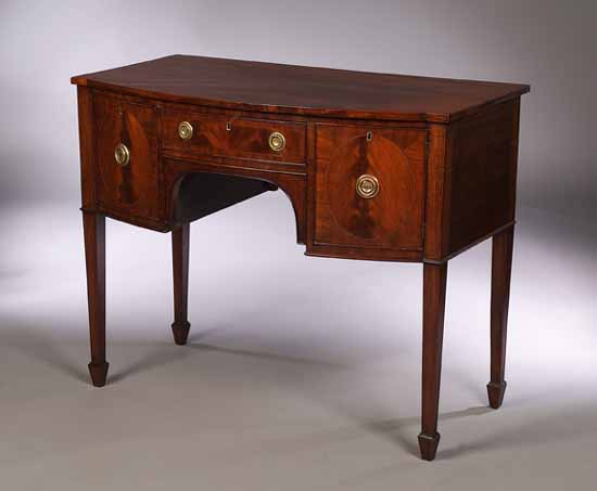 of small proportions in the George III manner, the shaped top above central drawer flanked by a deep drawer and a deep cupboard and raised on square tapering legs terminating in spade feet