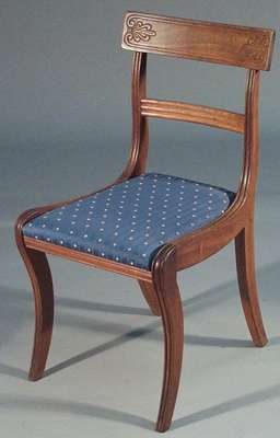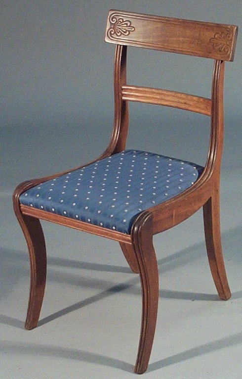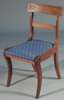 including one carver,each with curved and anthemion incised top rails with reeded uprights above drop; in seats on sabre legs (7)