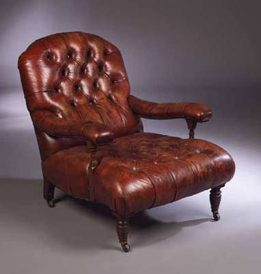 the morocco leather buttoned back and seat with studded decoration and open arms raised on turned front legs and castors