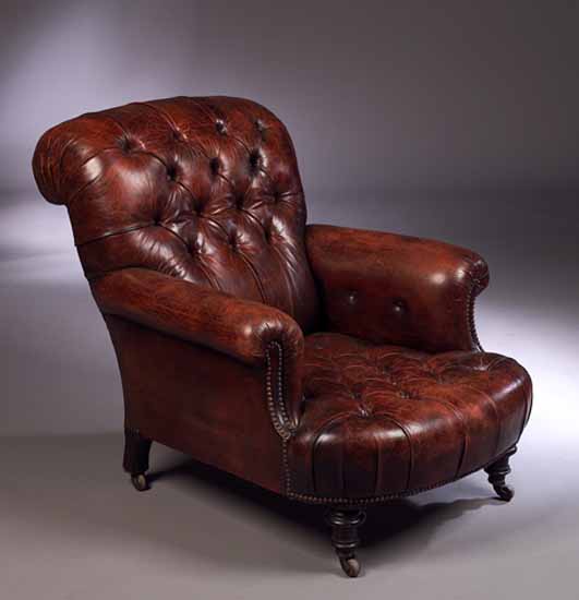the morocco leather buttoned back and seat with studded decoration and outscrolled arms, stamped Jas. Shoolbred & Co., raised on turned front legs and castors