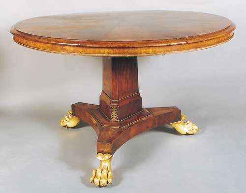 the circular top with radiating flame veneers and moulded edge above plain frieze with applied brass beading, the triangular section tapering column with canted angles and applied anthemion brasses raised above a triform base with boldly carved gilded paw feet