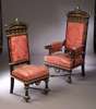 This extremely idiosyncratic set of chairs has several obvious design sources but remains of unkown origin. They bear some resemblance to the Jacobethan designs of Richard Bridgens and George Smith, as well as the later more antiquarian designs of Henry Whittaker. There is also a strong neo-Classical influence in the bronze mounts which aligns them with the taste of Regency aesthetes such as William Beckford and particuarly Thomas Hope. These Empire features might also suggest a Continental and particularly Italian origin.
