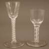 with semi-fluted bell shaped bowl, double white enamel twist stem on circular domed foot, 15cm, another smaller similar glass with plain ogee bell bowl and shorter double white enamel twist stem