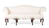the low padded back and high scroll arms above a padded seat, raised on scroll and foliate carved cabriole legs ending in scroll toes