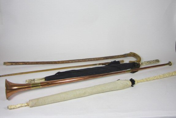 including a Japanese carved ivory and black sateen parasol with a figural carved handle and finial, 88cm; a French, Dieppe, carved ivory and black silk parasol with a fruiting vine carved handle and finial, 97cm; a horn and tortoiseshell walking stick with a gilt knop and collar, 79cm; a lacquered bamboo cane with a carved fish-form horn handle, 90cm; together with a BRASS & COPPER HUNTING HORN, 100cm (5)