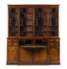 the moulded breakfront cornice over a pair of astragal glazed doors opening to shelves, flanked by further astragal glazed doors, the lower part with a central fall front opening to an interior fitted for writing, above a pair of cupboard doors, flanked by banks of two short drawers over further cupboard doors, on a plinth base