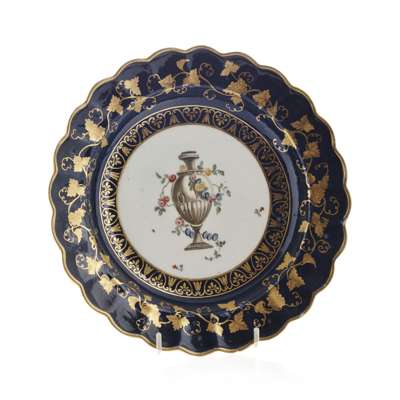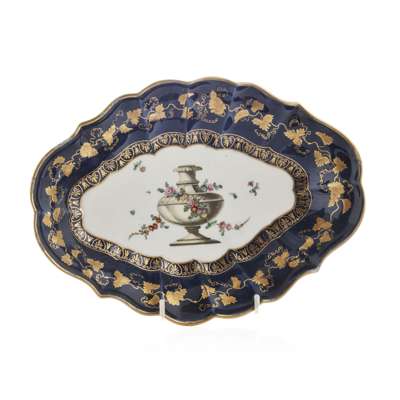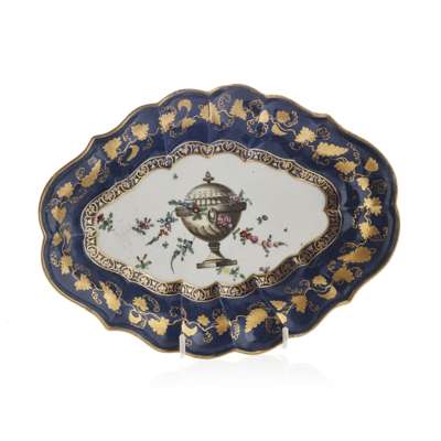 comprising a pair of circular plates and a pair of oval dishes, each with powder blue ground and gilt leaf decoration, with central reserve of a painted urn with floral swags, open crescent marks (4)