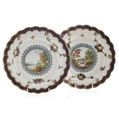 PAIR OF WORCESTER FIRST PERIOD PORCELAIN SCALLOP SHAPED DISHES AND A PAIR OF PLATES