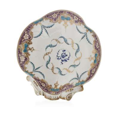 comprising a small sauce tureen and cover of oval shape with shell-moulded handles and a fruit finial with matching stand; and a shaped serving dish; and two circular plates, each painted in the Sèvres style with swags of turquoise and black husks suspended from a border containing turquoise and purple panels edged with gilt scrollwork, apparently unmarked (5)