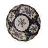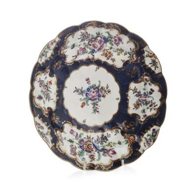 each with slightly lobed rims, with blue fish scale ground and gilt reserve panels of bouquets of flowers, underglaze blue 'Chinese' seal mark 24.5cm wide; and a WORCESTER PORCELAIN OVAL DISH, CIRCA 1775, with gilt rim, the 'twig' handles with applied flower heads, blue fish scale ground with gilt reserve panels of floral bouquets, underglaze fret mark, 25cm wide (3)