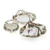 of circular form, applied floral clusters to the border, twig handle, vignette of a church by a river to the centre, purple full Rockingham mark, 16cm diameter; a ROCKINGHAM BRAMELD FLORAL ENCRUSTED BASKET, with woven 'twig' handle, full Rockingham mark to underside, 31cm diameter; and a ROCKINGHAM STYLE BASKET, of slight lozenge form, with moulded floral decoration and green border, naturalistic twist 'twig' handle, painted central floral spray, 31cm diameter (3)