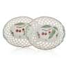 of oval form with pierced latticework sides, twist handles and rim in gilt and bleu celeste, each decorated with a sprig of fruit to the centre, purple mark to base (2)