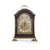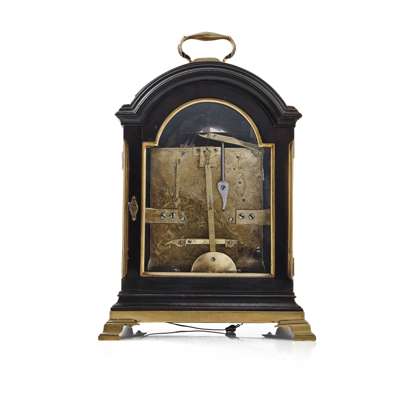 the arched case with brass carrying handle, the arched plate with two dials to the arch, one for strike/silent, the other rise/fall regulation, the main dial with silvered chapter ring, Roman and Arabic numerals, the centre with visible bob pendulum, cast spandrels, the case with brass rule edge detail, all on brass ogee bracket feet, the movement with twin fusee striking on one bell, the engraved back plate marked JN. FLADGATE/ LONDON
