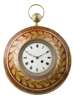 the circular case painted in gilt with trailing laurel leaves and berries on a red ground, brass ring hanging handle, the white enamel dial with Roman numerals, the twin barrel movement with silk suspension, count wheel strike to bell