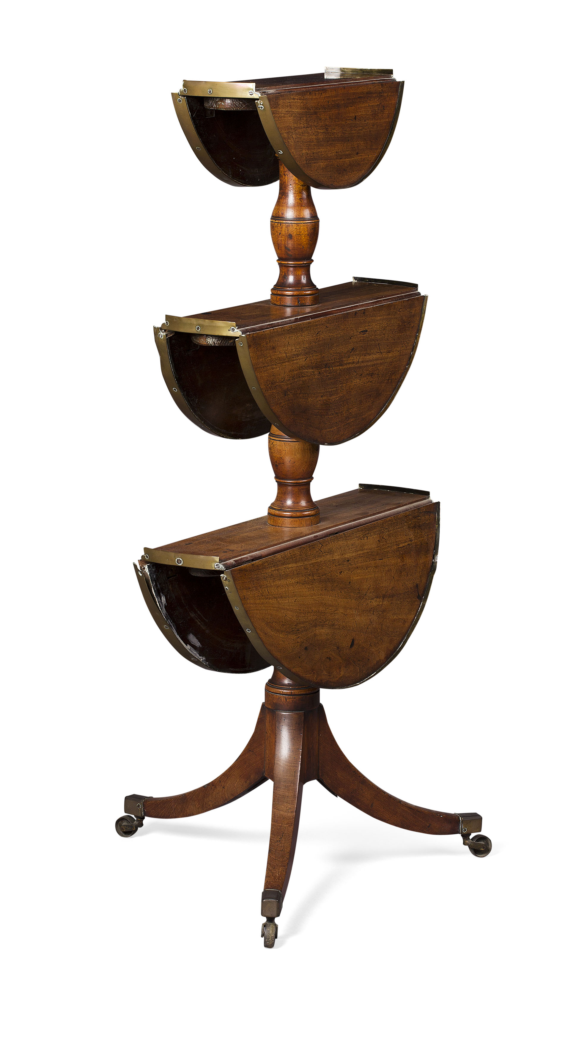 with three graduated circular brass banded tiers with drop-leaf sides, raised on a turned baluster support and sabre tripod base ending in brass caps and casters