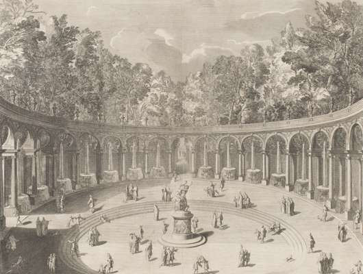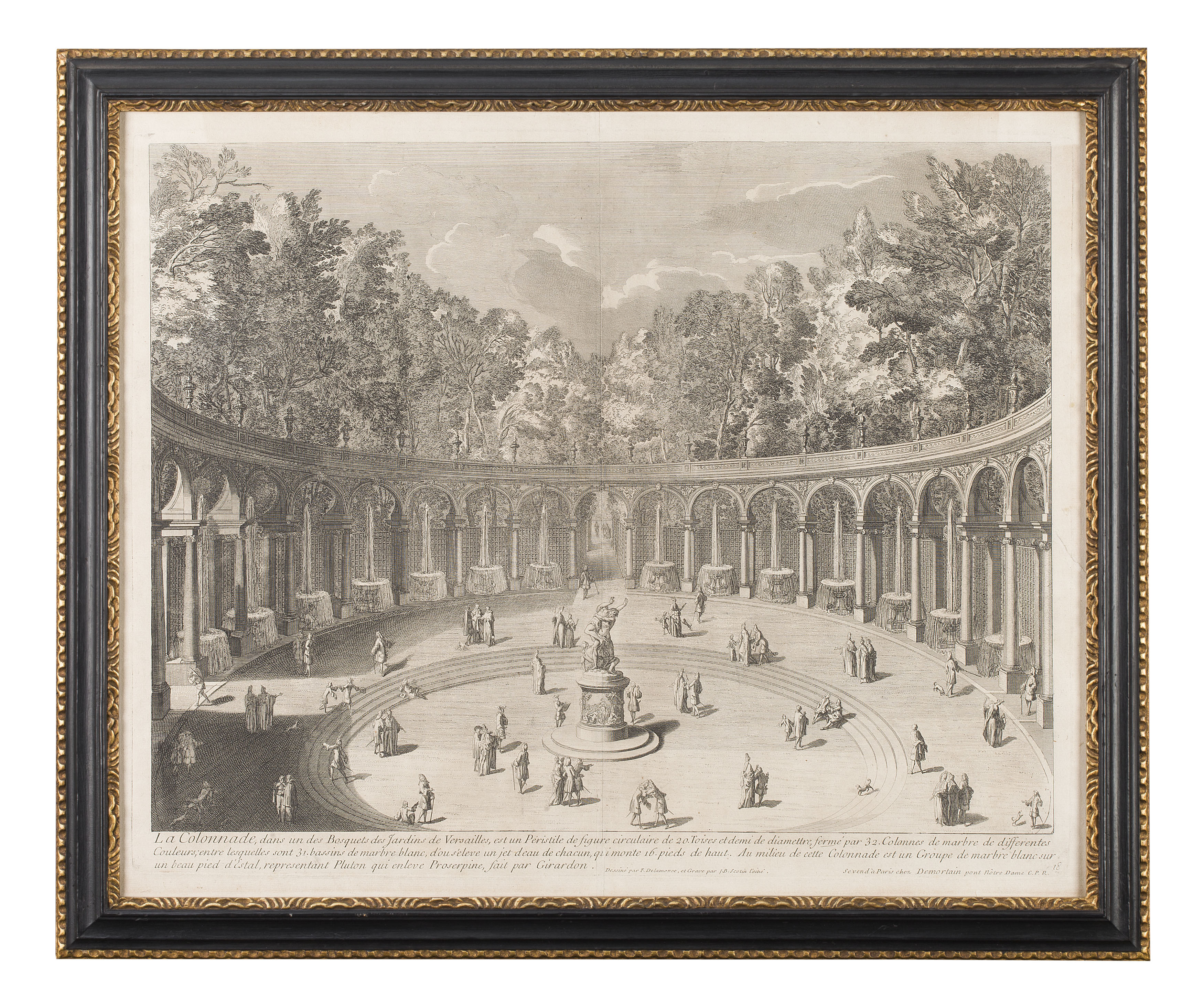 early 18th century print published by Gilles Demortain; inscribed 'Dessiné sur les lieux par P. Martin peintre du Roy' and 'de Rochefort sculp.', publication line: 'a Paris chez Demortain Pont N. Dame'; and another print, LA COLONNADE DANS UN DES BOSQUETS DES JARDINS DE VERSAILLES...after Ferdinand Delamonce, also published by Gilles Demortain and inscribed 'Dessiné par F. Delamonce, et Grave par J. B. Scotin l'ainé', publication line: 'a Paris chez Demortain Pont Nôtre-Dame' (2)
