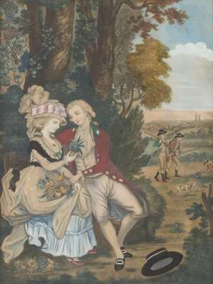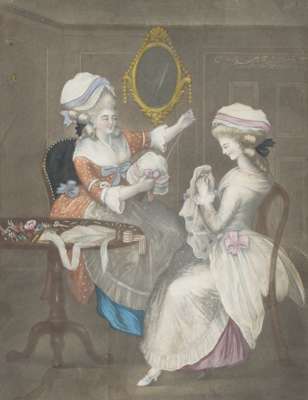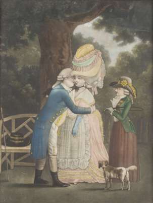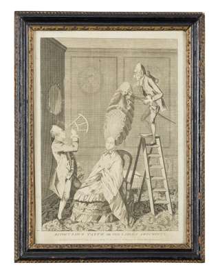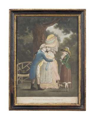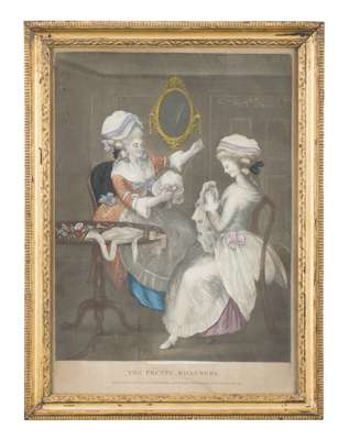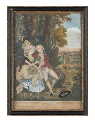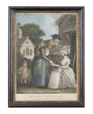 to include; SPRING; SUMMER and AUTUMN, three coloured prints by Jas. Watson and R. Pyle, 36cm x 25.5cm A SCENE IN KENSINGTON GARDENS; THE GYPSIE FORTUNE TELLER; THE PRETTY MILLENERS and AUTUMN, by Sayer and Bennett, each approx. 36cm x 25cm POLLY'S LAMENTATION, by Carington Bowles, 35.5cm x 25.5cm RIDICULOUS TASTE OR THE LADIES ABSURDITY, by Darby and Sayer, 35.5cm x 26cm CHARLOTTE, QUEEN OF GREAT BRITAIN, by Bowle, 35cm x 25cm and a REVERSE PAINTING ON GLASS, depicting a lady, and contained within a maple frame, 36cm x 26cm (11)