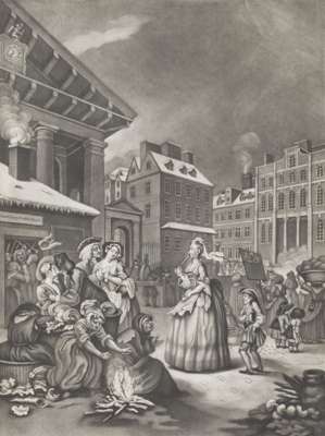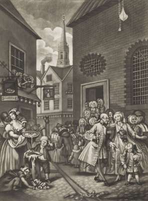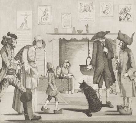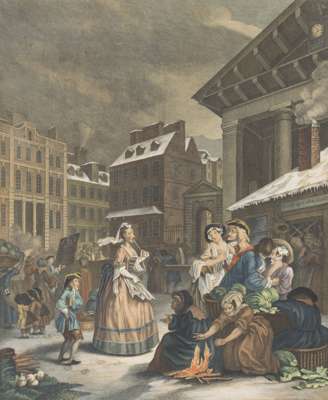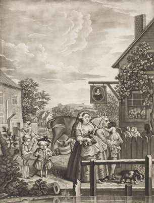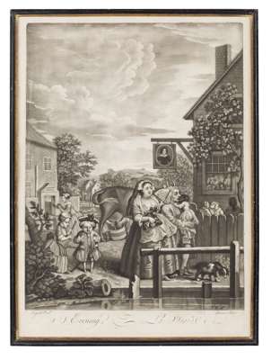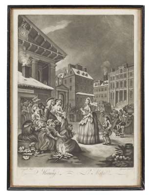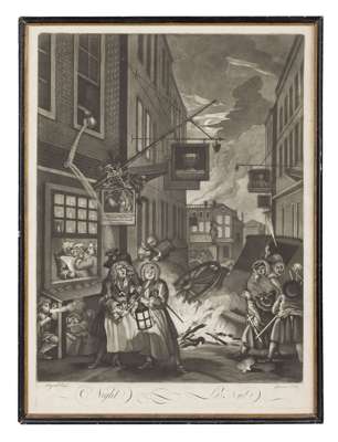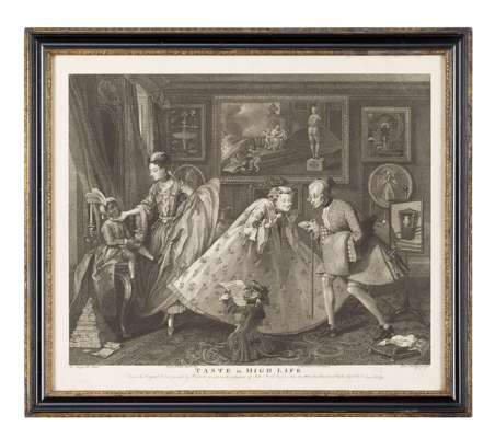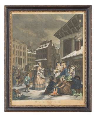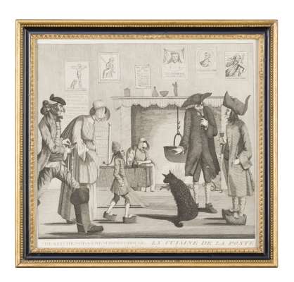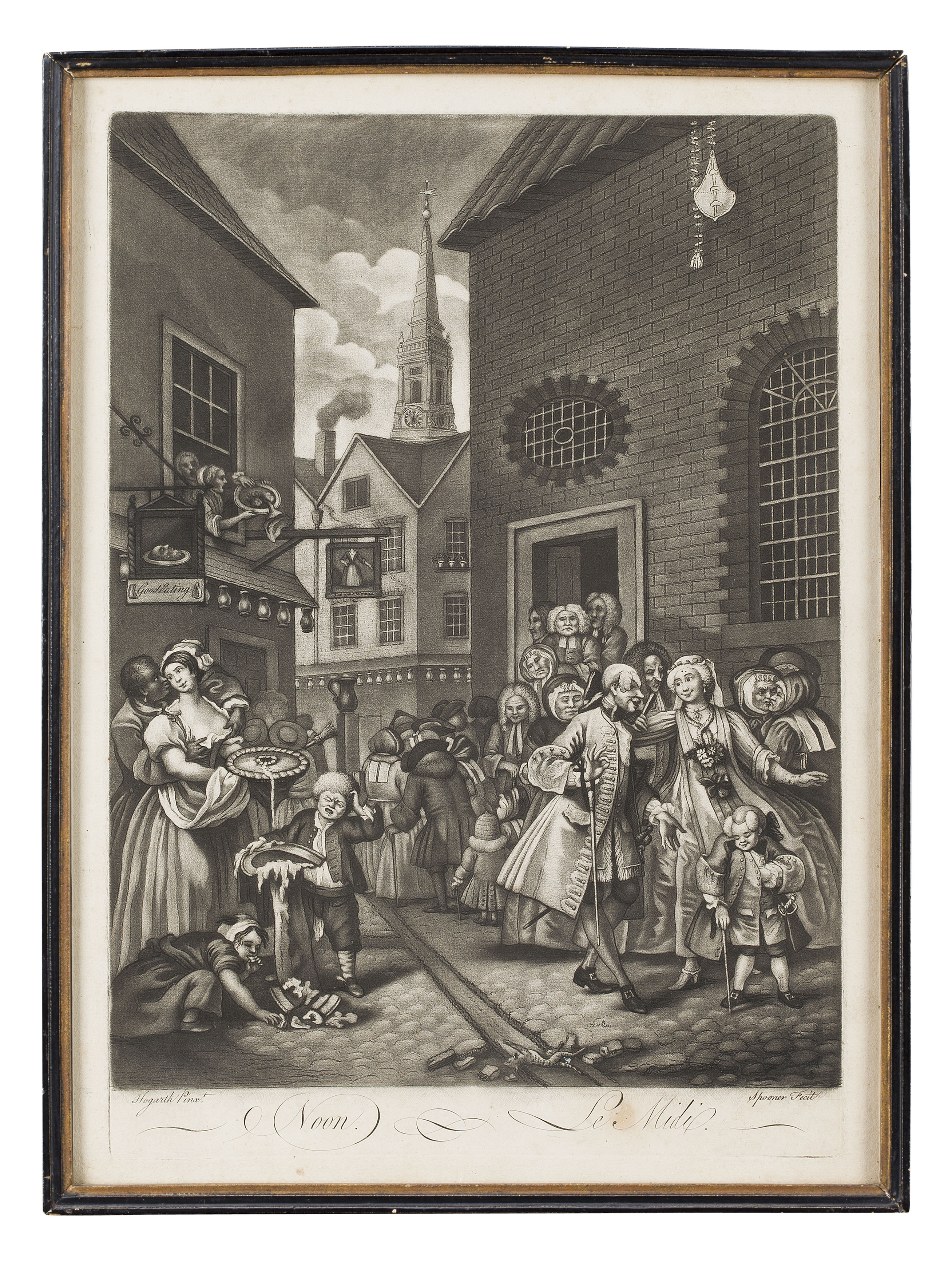 including MORNING/ LE MATIN; NOON/ LE MIDI; EVENING/ LA SOIREE and NIGHT/ LA NUIT, by Spooner, each 37.5cm x 27cm; MORNING, coloured print by G.G. & J. Robinson, 49cm x 39cm; also TASTE IN HIGH LIFE by Boydell, 40cm x 48cm; and THE KITCHEN OF A FRENCH POST HOUSE/ LA CUISINE DE LA POSTE, by Bunbury, published by John Harris, 40cm x 42cm (7)