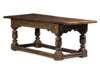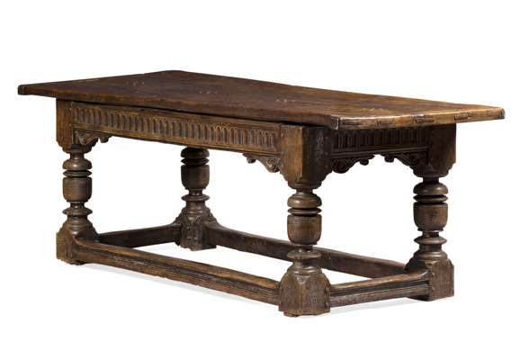 the two plank top with cleated ends, over a chip carved frieze and scroll brackets, raised on cup and cover legs joined by peripheral stretchers
