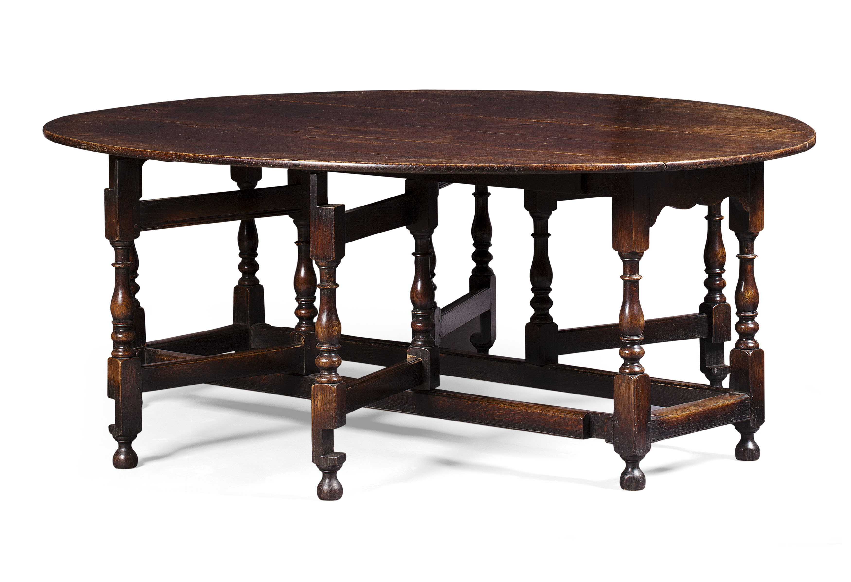 the oval top with drop leaf sides raised on baluster turned legs joined by peripheral stretchers and ending on turned feet