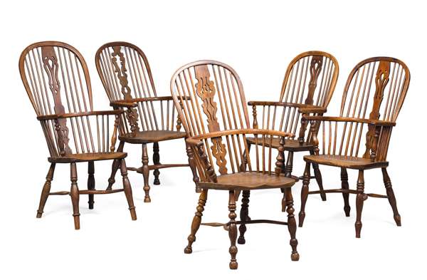 MATCHED SET OF FIVE ELM WINDSOR ARMCHAIRS