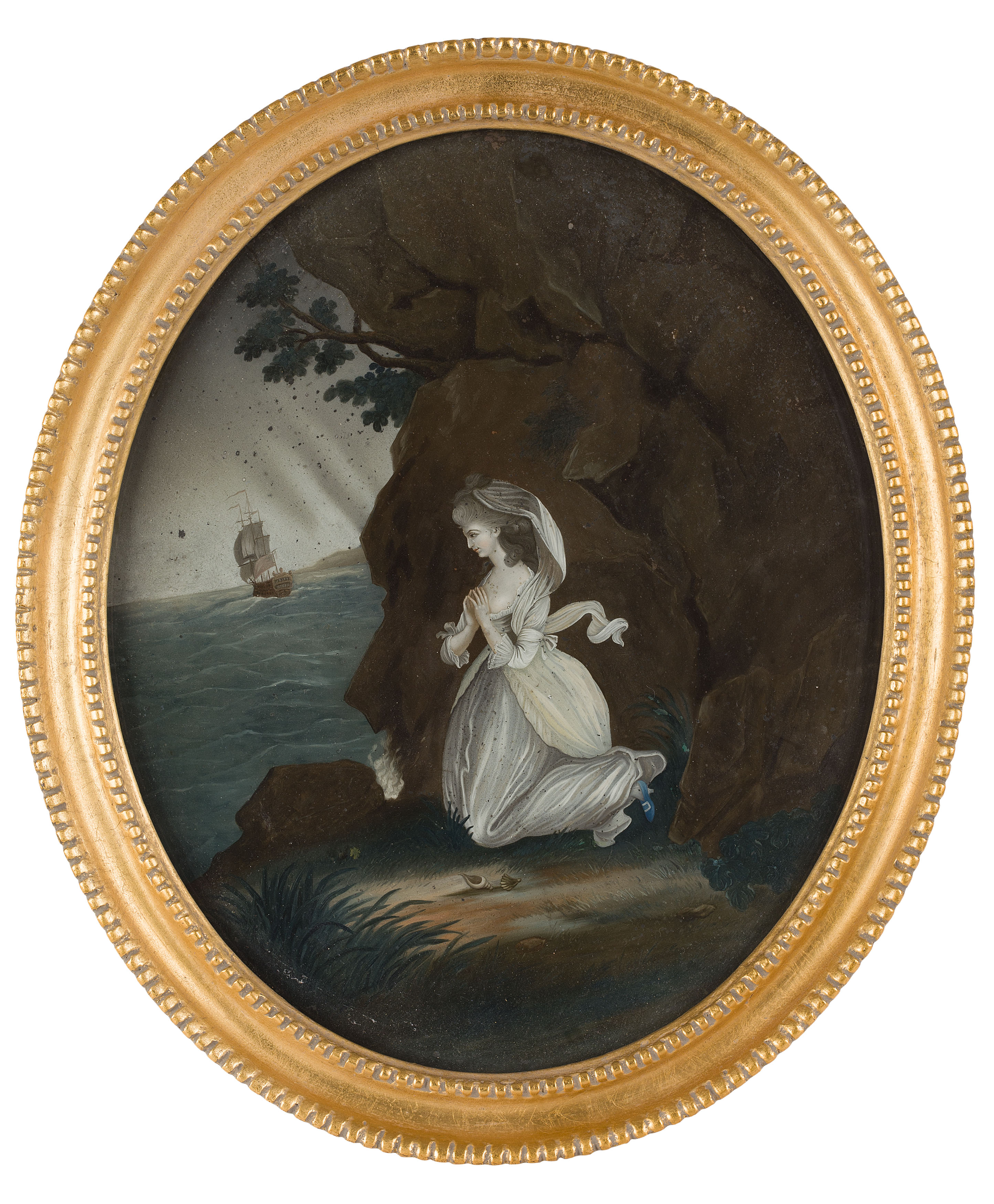 the oval plate painted with a kneeling European aristocratic lady by the shore, watching a ship sailing away, within a moulded giltwood frame