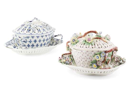 the pierced cover with applied flowers and branch handle, the whole decorated blue on white with floral sprigs, crescent mark, stand 27.5cm across; and a CHELSEA CHESTNUT BASKET, COVER AND STAND, the pierced cover with applied flowers and branch handle, the whole polychrome-decorated with floral sprigs, red anchor mark, stand 25cm across (2)